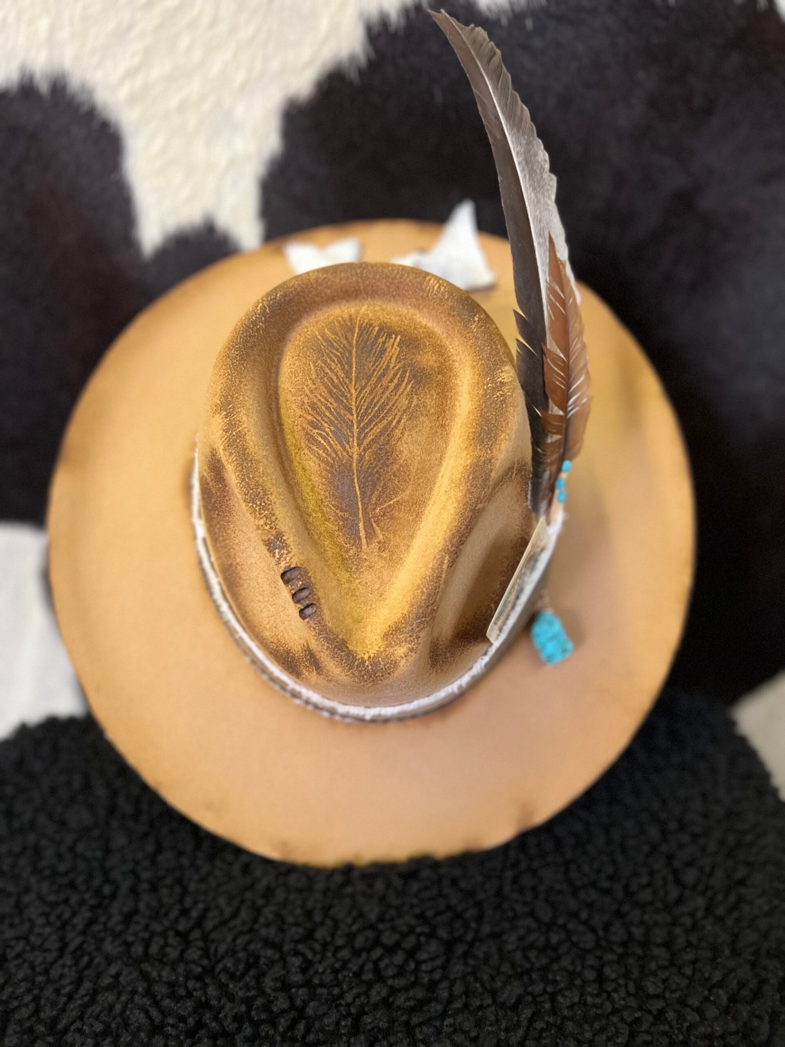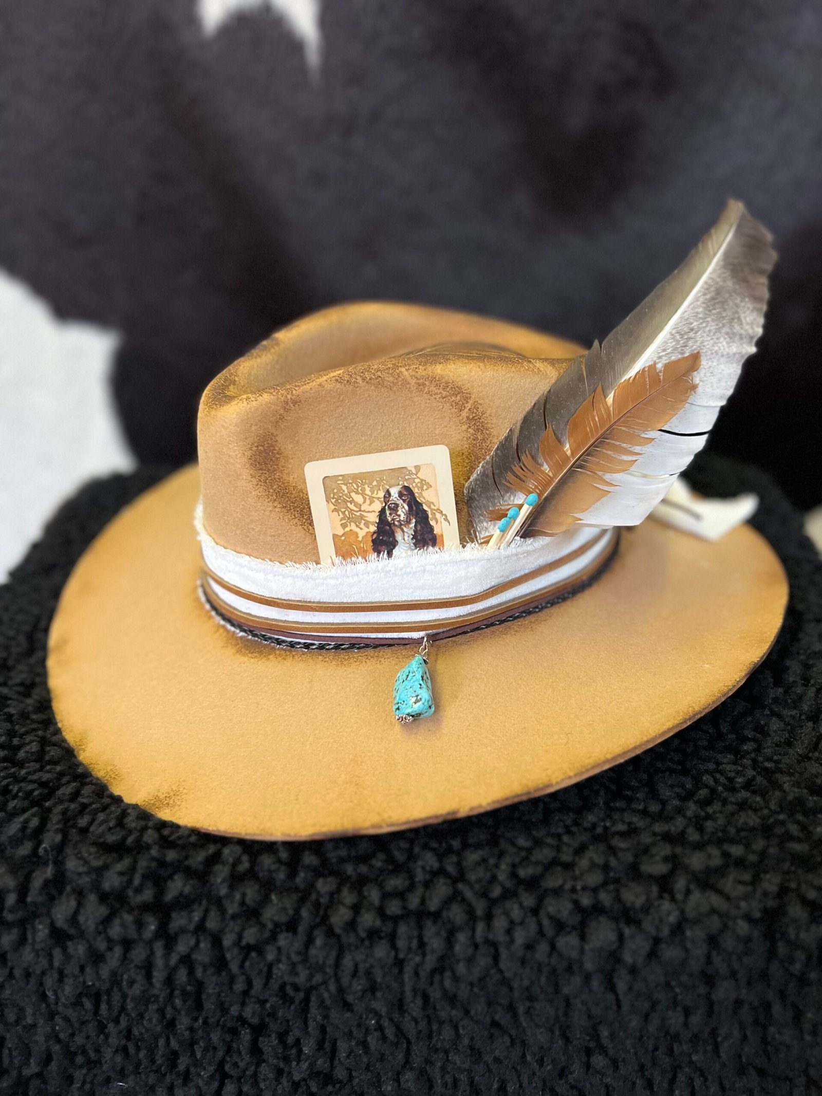Wool felt, adjustable fit. Crown art and band set with playing card, feathers and turquoise stone is a head turner. Named after the Hanging Dog community in Cherokee County, located in western North Carolina.