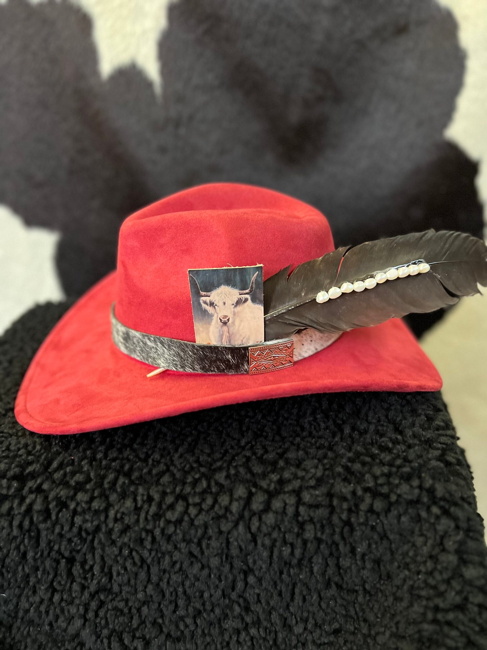 This vegan suede beauty sports a cowhide band and silver concho with a pearl feather and a whimsical leather card. Adjustable band fits most sizes.