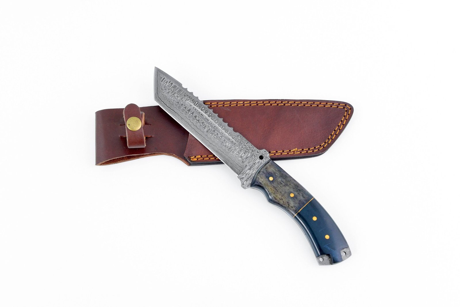 This High Carbon 400 Layer Damascus Beast Tanto has a stout tango blade, unlike most tanto's, it is 0.250" thick and carries that thickness almost to the tip. It is extremely strong but still has great penetration for stabbing and prying. This knife is a must have weather you are a hunter, camper or survivalist. Don’t leave home without it!